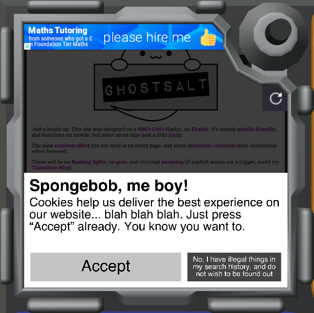 Based off of those annoying cookie popups, and threw in a banner ad, too. Not very fleshed-out, but it (hopefully) will be!
